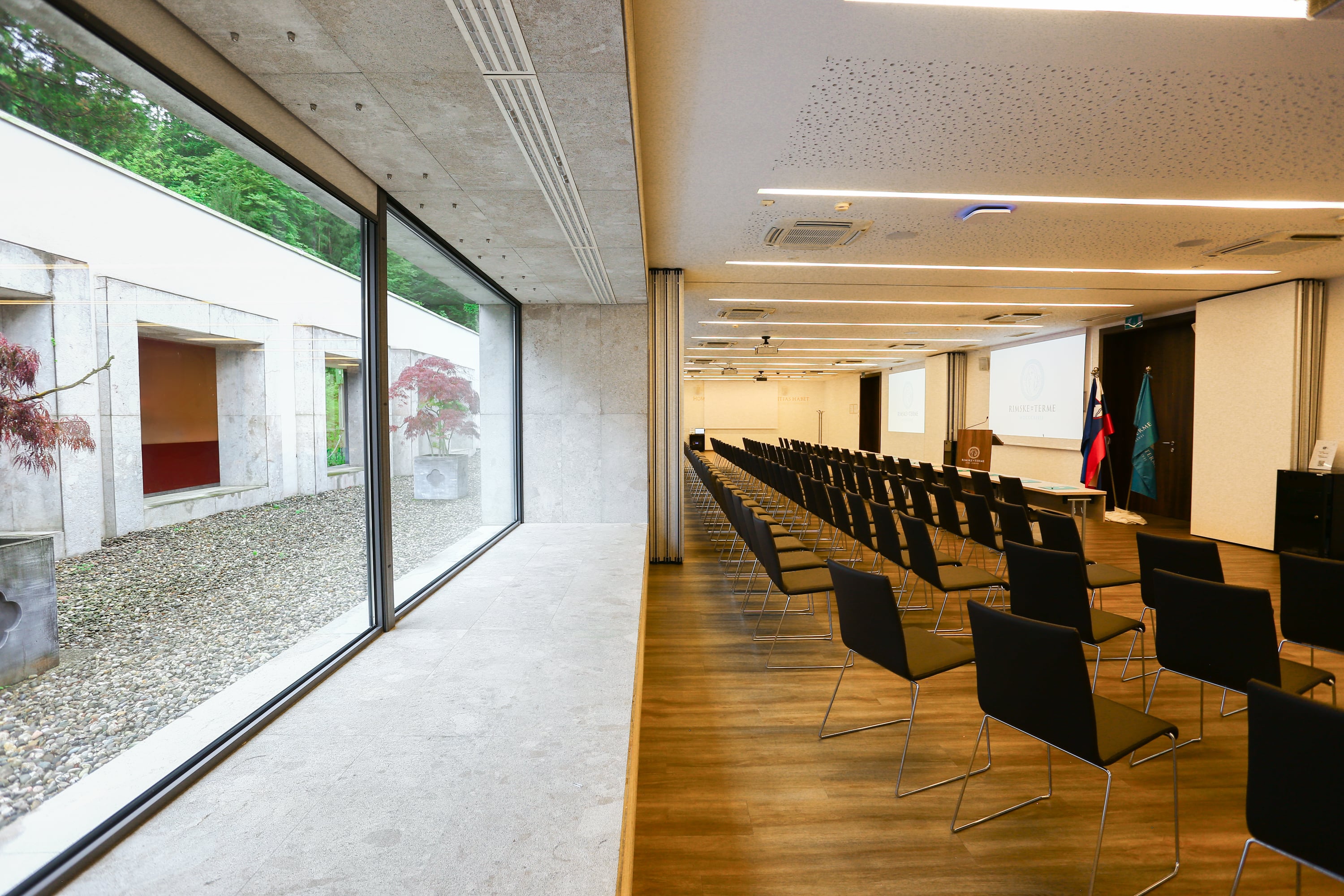 The congress centre is characterized by the flexibility of the halls. In it, modern common spaces are intended for socializing, banquets or receptions. Different combinations of layouts are possible in different halls for optimal use of space and a pleasant feeling during the event itself.
